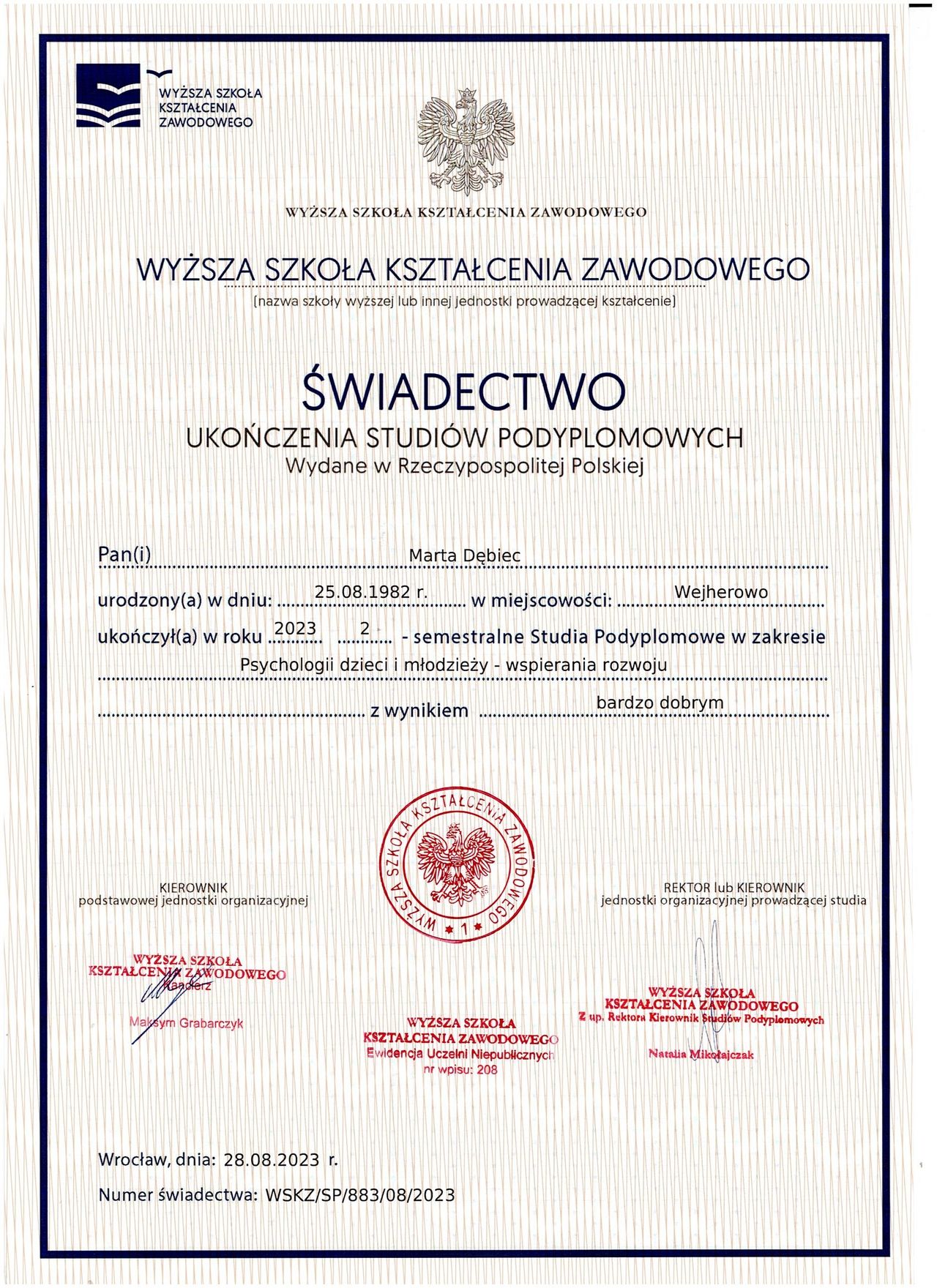 Od 18 lat pracuję z dziećmi i ich rodzinami. Pasja do mojego zajęcia skłoniła mnie do poszerzenia moich kwalifikacji o umiejętności i kwalifikacje do wsparcia psychologicznego. Jestem magistrem psychologii wspomagania rozwoju człowieka, specjalizuję się we wspieraniu rozwoju dzieci i młodzieży. Poza pięcioletnimi studiami magisterskimi, ukończyłam również studia podyplomowe nakierowane wlasnie na psychologię mlodszych podopiecznych. Moją pasją jest zgłębianie tajemnic ludzkich emocji. Ukończyłam kurs TSR (Terapia skoncentrowana na rozwiązaniach) oraz CBT (Terapia poznawczo- behawioralna). Jestem certyfikowanym diagnostą i terspeutą Terapii Ręki. Od dawna pracuje z dziećmi w spektrum autyzmu i niepełnosprawnymi intelektualnie. Wspieram dzieci i ch rodziny oraz oracuje z osobami dorosłymi oraz parami i rodzinami. Cały czas doszkalam się, zdobywając nowe kwalifikacje i, przede wszystkim, umiejętności. Jestem nauczycielem przedszkolnym i szkolnym oraz oligofrenopedagogiem.