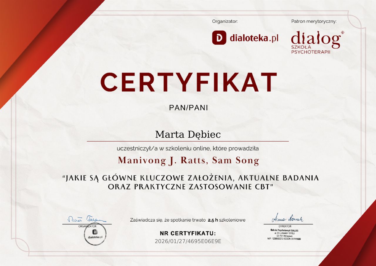 Od 18 lat pracuję z dziećmi i ich rodzinami. Pasja do mojego zajęcia skłoniła mnie do poszerzenia kwalifikacji o umiejętności i możliwości do wsparcia psychologicznego. Jestem magistrem psychologii wspomagania rozwoju człowieka, specjalizuję się we wspieraniu rozwoju dzieci i młodzieży. Poza pięcioletnimi studiami magisterskimi, ukończyłam również studia podyplomowe nakierowane właśnie na psychologię mlodszych podopiecznych. Moją pasją jest zgłębianie tajemnic ludzkich emocji. Ukończyłam kurs TSR (Terapia skoncentrowana na rozwiązaniach) oraz CBT (Terapia poznawczo- behawioralna). Jestem certyfikowanym diagnostą i terapeutą Terapii Ręki. Od dawna pracuje z dziećmi w spektrum autyzmu i niepełnosprawnymi intelektualnie. Wspieram dzieci i ch rodziny oraz pracuje z osobami dorosłymi, parami i rodzinami. Cały czas doszkalam się, zdobywając nowe kwalifikacje i, przede wszystkim, umiejętności. Jestem nauczycielem przedszkolnym i szkolnym oraz oligofrenopedagogiem.